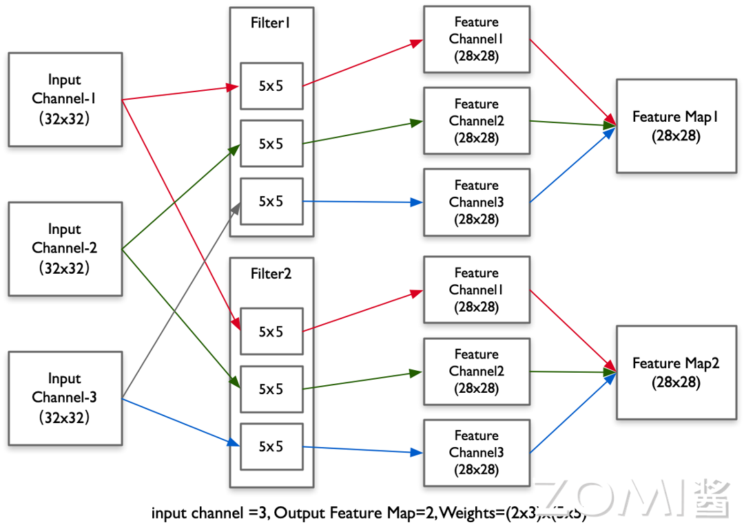 • 形状示例:输入 (3\times32\times32) 经 (2\times3\times5\times5) 卷积 → 输出 (2\times28\times28)。