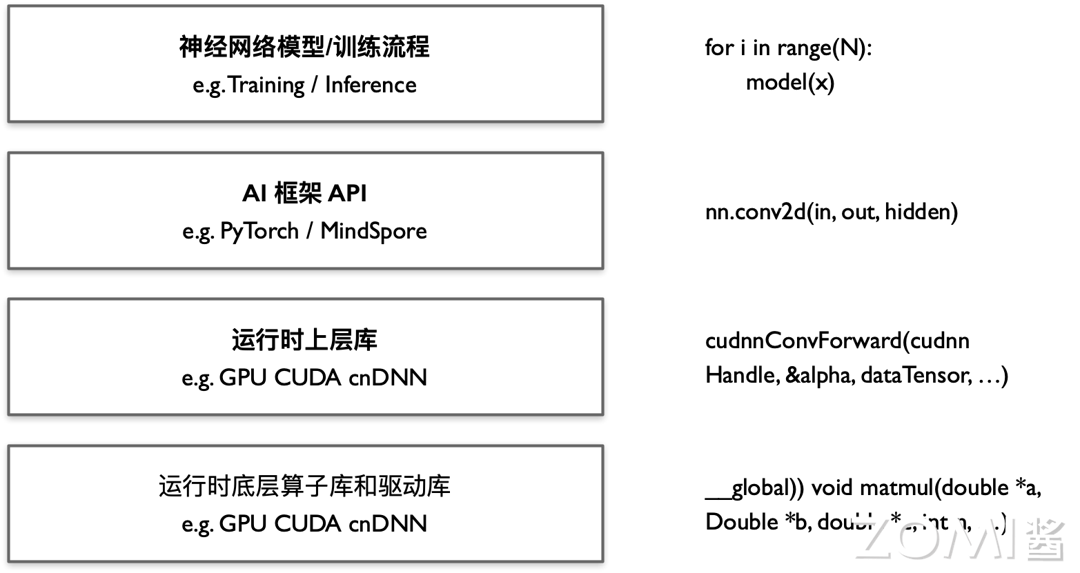 “上层仅需 Python + 框架 API;底层通过算子库(cuDNN/cuBLAS 等)与编译/运行时完成 Kernel 执行。”